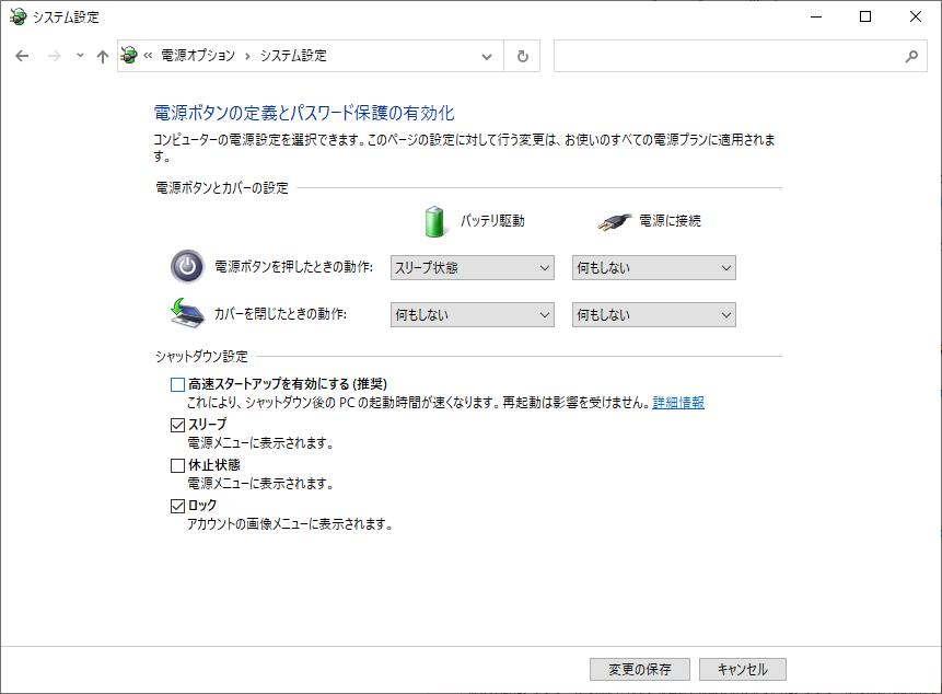 - 「高速スタートアップを有効にする」チェック・ボックスのチェックを外し、「変更の保存」をクリックします。